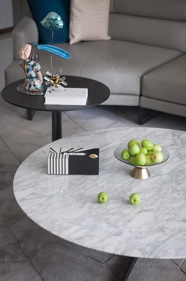- 布局:皮质沙发+圆形岩板茶几,留足走动空间(贵阳小户型也能抄);单椅配深