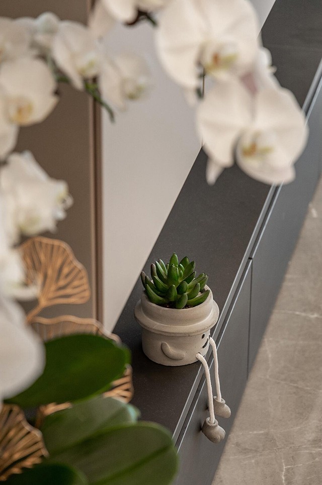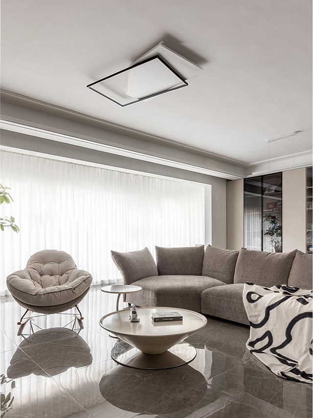 浅棕、米白为主色调,温柔又高级。花瓣型沙发软糯舒适,搭配造型独特的单人
