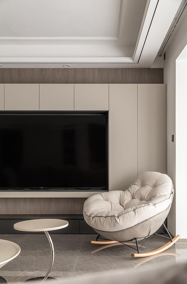 椅,坐感拉满。悬浮电视柜简洁利落,下方还能储物。采光绝了,大窗户配白纱