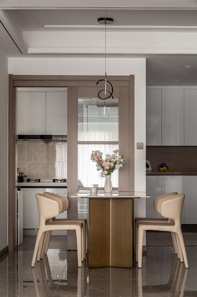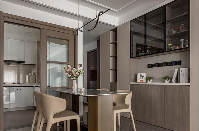 餐厅和厨房衔接自然。餐桌简约大气,搭配同色系餐椅,温馨感十足。厨房用玻