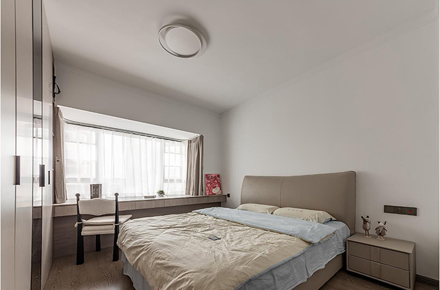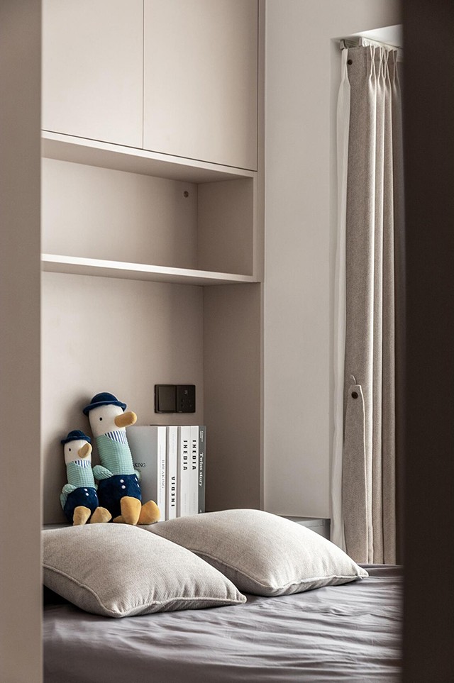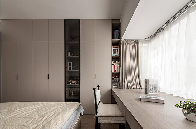 主卧延续整体的柔和色调,衣柜是定制的,嵌入式设计超省空间,还有玻璃展示