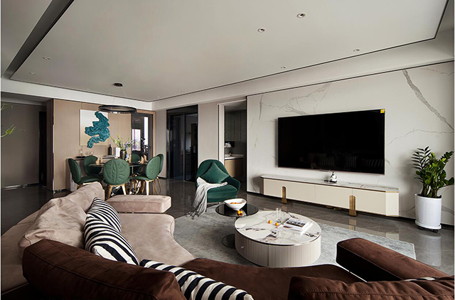 - 大理石纹理茶几+金属细腿,轻透不压空间;背景墙选了水墨纹岩板,自带冷调
