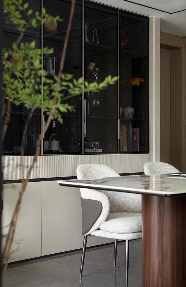 - 隐藏式酒柜+玻璃门展示区,藏起杂乱、露出精致,灯光一打直接变成客厅“氛
