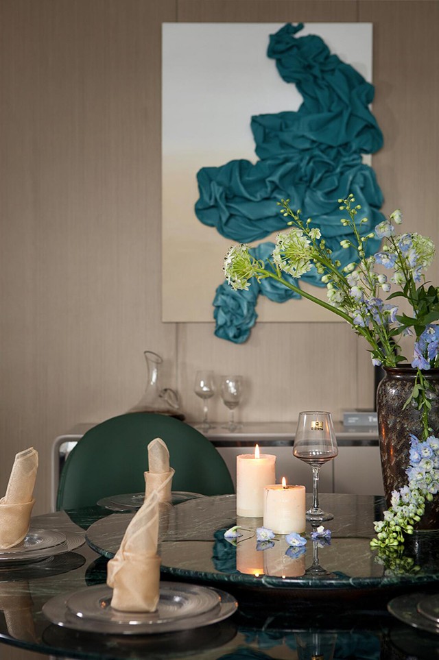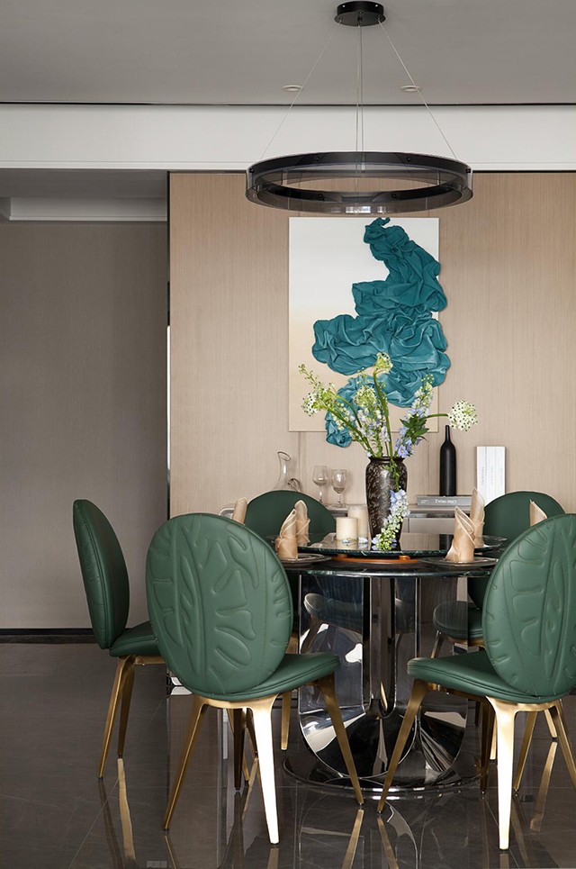 - 墨绿色皮质餐椅+金属细腿,复古又显贵,搭配圆形玻璃餐桌,通透感拉满~