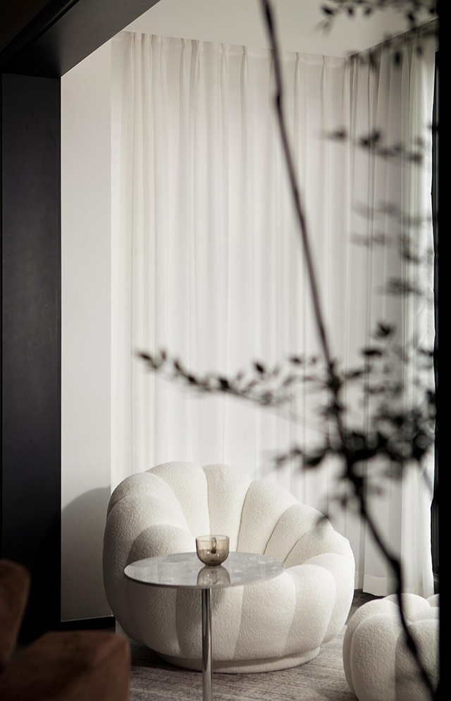 - 落地窗+白纱帘,把窗外光线全“兜”进家里,摆上单人沙发+小边几,就是晒太