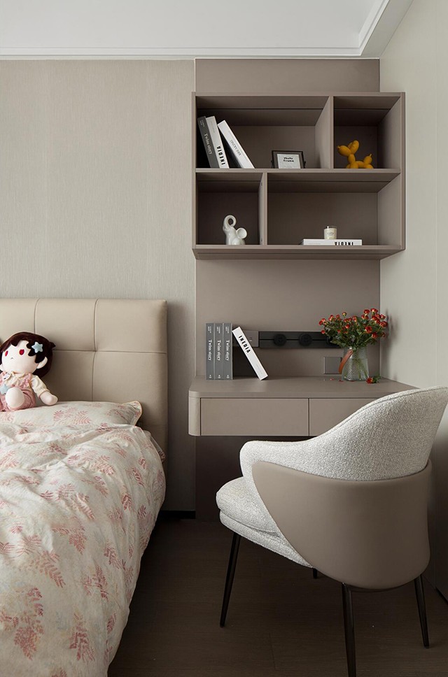 - 浅奶茶色墙布+同色系软包床头,自带柔光滤镜,搭配带细碎花纹的床品,温馨