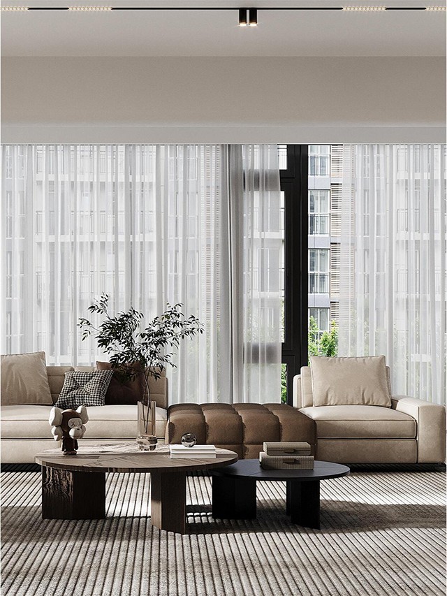 - 细节藏巧思:悬浮电视柜+内嵌灯光展示柜,藏起杂乱、露出精致;白纱帘过滤