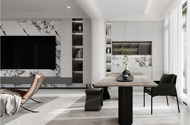 - 餐厨区:白岩板中岛+暖木柜,搭配金属线条吊灯,做饭时的烟火气都变高级;