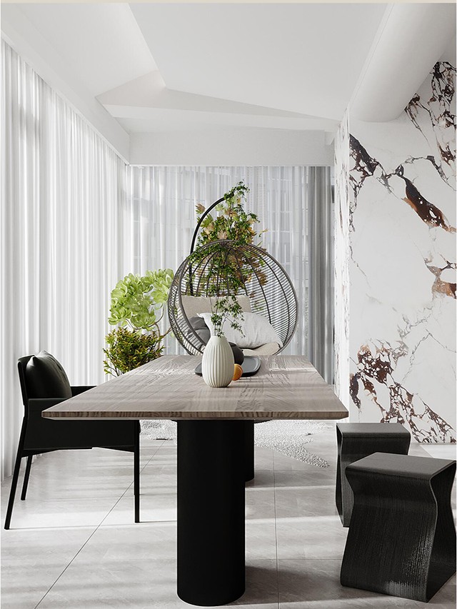 - 茶区:黑胡桃木长桌+异形矮凳,搭配茶具和枯枝花艺,把“中式茶席”搬进现
