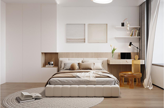 - 主卧:奶白软包床+半墙拼色,搭配悬浮床头柜+艺术挂画,温馨里裹着轻奢质