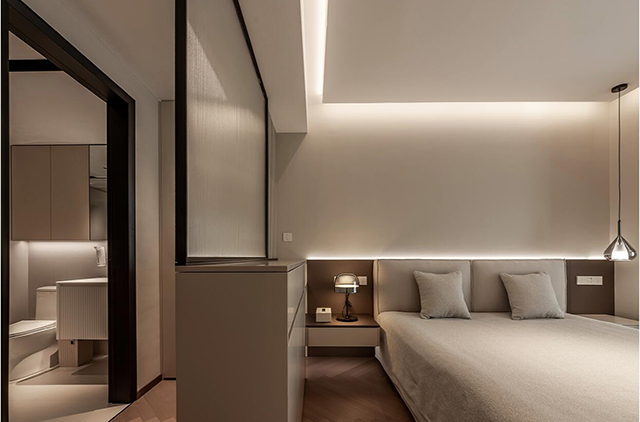 - 软包床头+奶杏床品,搭配半墙拼色+线性灯,温馨又不沉闷;悬浮床头柜+隐形