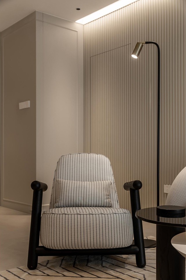- 细节藏巧思:墙面做了部分竖向格栅+艺术画,简约不单调;悬浮电视柜+隐形