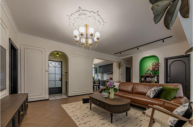 1. 线条要柔: 拱门、圆弧柜角、雕花石膏线,用曲线柔化复古厚重感;