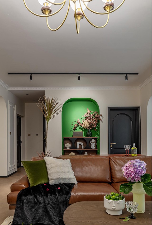 - 沙发选焦糖棕皮质款,自带中古年代感,搭毛绒抱枕+墨绿靠垫,冷暖质感中和