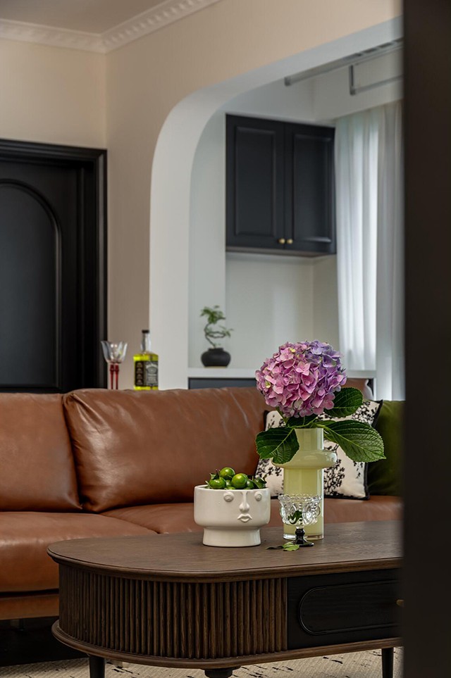 拱门+石膏线是灵魂!客厅和餐厨区用圆弧拱门做过渡,柔化了空间棱角;墙面石
