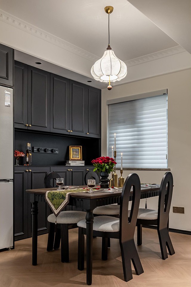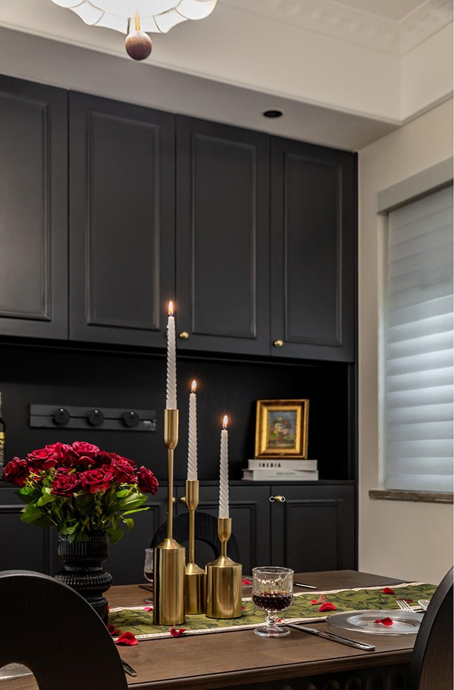 - 餐边柜/电视柜统一用深黑+黄铜拉手,玻璃柜门透出杯碟,复古贵气不闷;