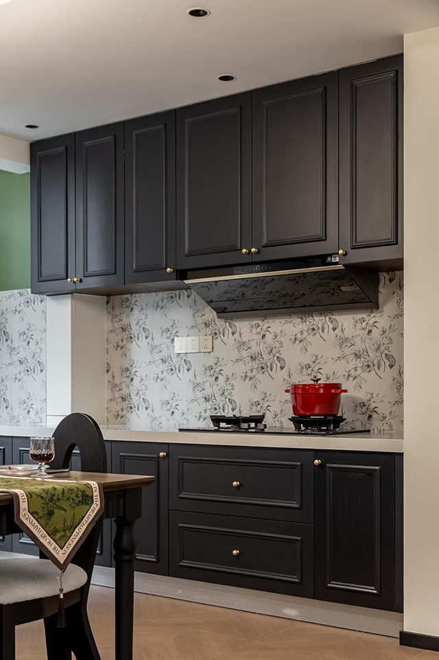 全黑橱柜配奶白花砖,复古又耐脏;台面选浅米色石英石,和墙面花砖呼应不跳