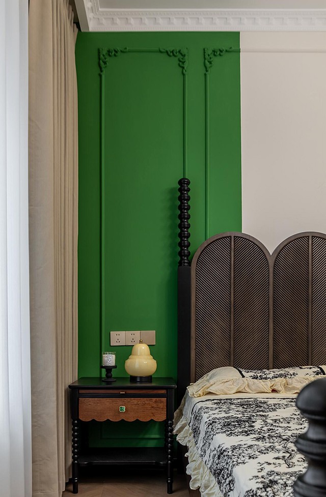 背景墙刷复古墨绿,配石膏线雕花,直接拿捏法式浪漫;床选藤编+深色木框,四