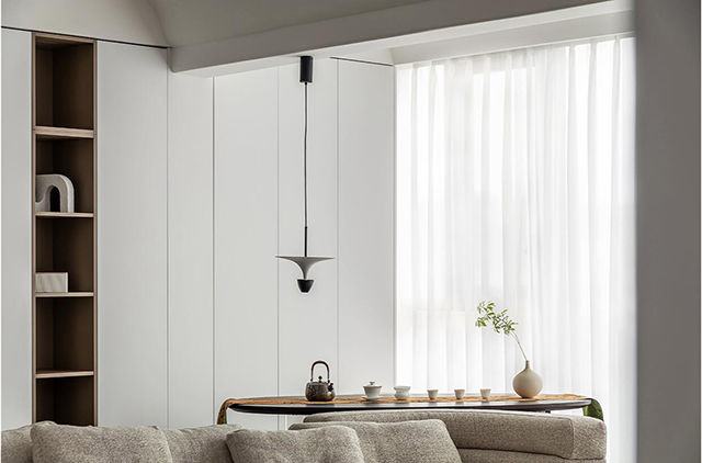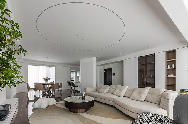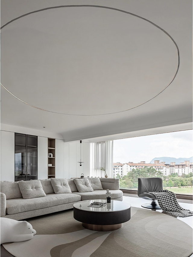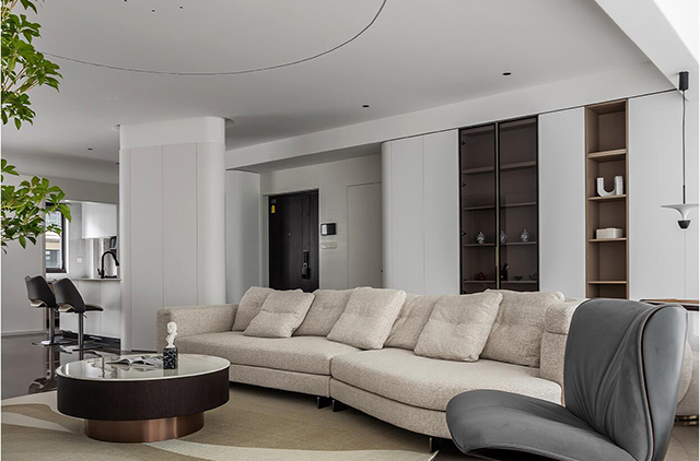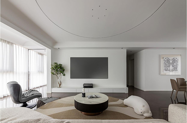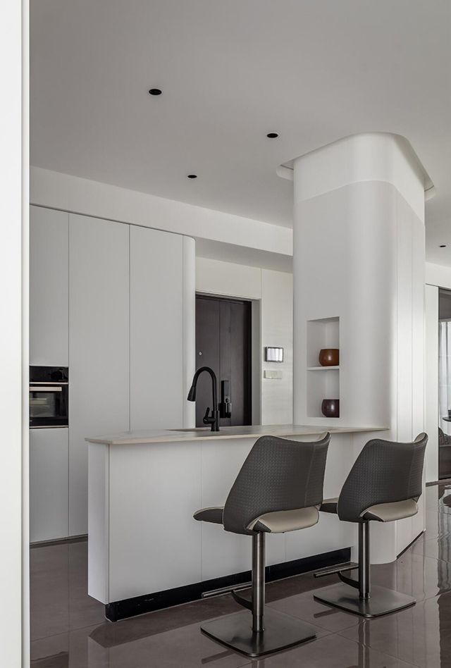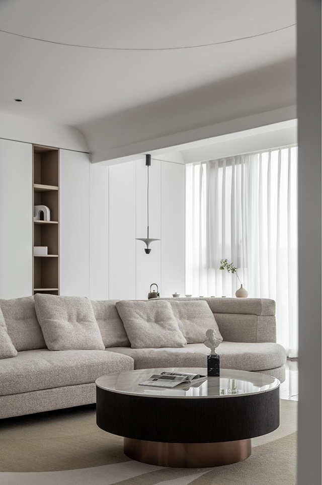 1. 线条要柔: 圆弧吊顶、弧形立柱、隐形拉手,用曲线弱化极简的“冷”;