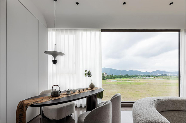 - 靠窗做长条茶桌+矮凳,窗外是山景,喝茶时像把自然搬进了家~
