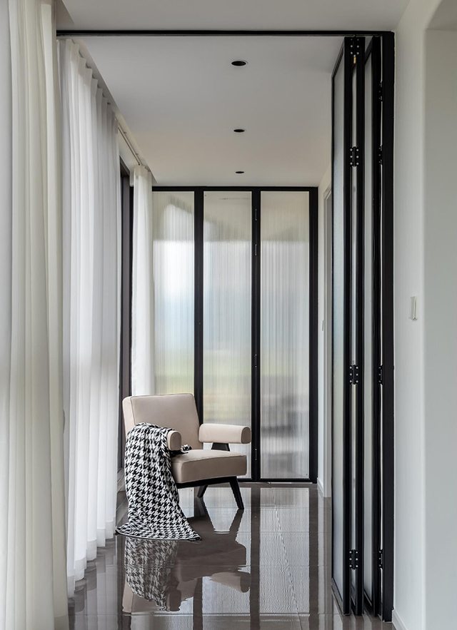 - 走廊: 长虹玻璃隔断+黑色金属框,透光不透人,把光影揉成了流动的装饰;