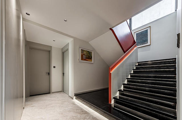 黑色石材台阶+红色金属扶手,冷调里撞出亮眼细节;墙面挂艺术画,连上楼都像